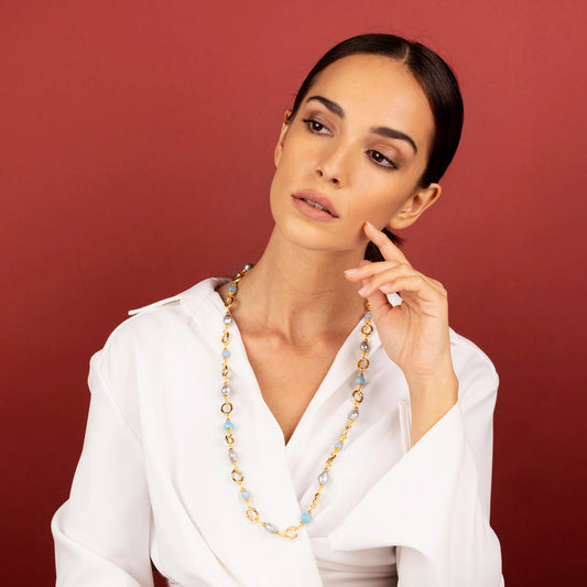 Collana Lunga con Anelli Martellati Quarzite Celeste e Perle d'Acqua Dolce Grigie Ø 11/11.5 mm Sku: WSET00471