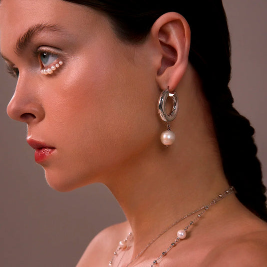 Orecchini a Cerchio in Argento 925 placcato Oro Bianco 18Kt con Perle Ming Bianche d'Acqua Dolce Ø 12/13 mm Sku: MTV122