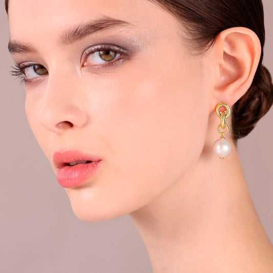 Orecchini Pendenti in Argento 925 placcato Oro Giallo 18Kt con Perle Ming Bianche d'Acqua Dolce Ø 11/13 mm Sku: MTV548