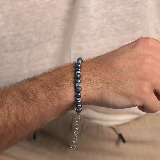 Bracciale con Rondelle Texture Rigata e Perle Grigie Cerchiate d'Acqua Dolce Ø 6/7 mm in Argento 925 Sku: WSOX00587