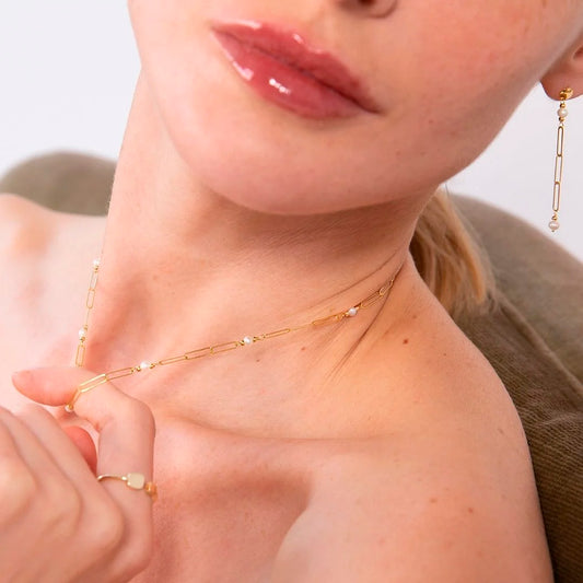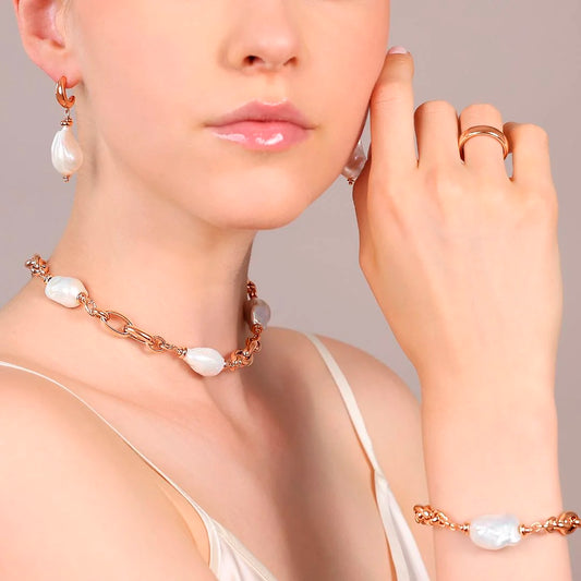 Collana Girocollo con Maglie Ovali Intrecciate e Perle Barocche Bianche d'Acqua Dolce Ø 13/14 mm Sku: WSBZ02383