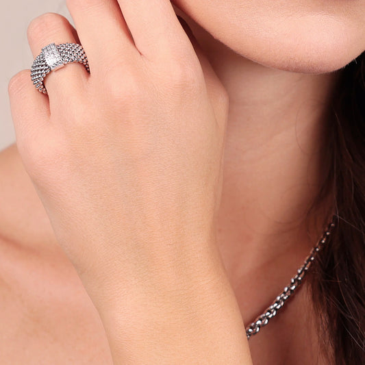 Anello a Fascia Maglia Popcorn in Argento 925 placcato Platino con Pavé di Cubic Zirconia Sku: MTV769