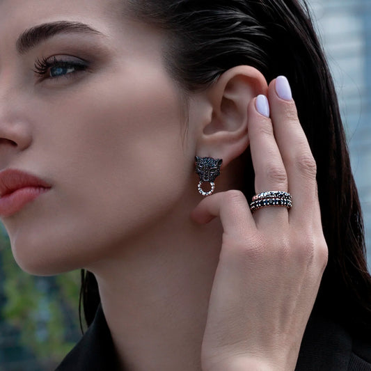 Orecchini Pendenti a Cerchio Texture con Serpente e Spinello Nero in Argento 925 Sku: WSOX00421