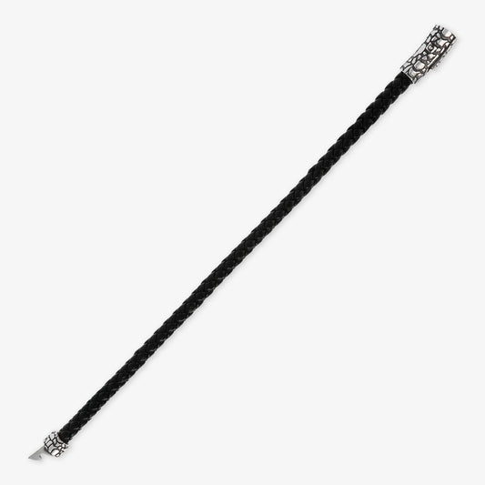 Bracciale in Cuoio Intrecciato con Chiusura Texture e Pavé in Spinello Nero in Argento 925 Sku: WSOX00495