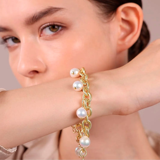 Bracelet Charms Perles d'Eau Douce Blanches Ming Ø 10/11 en Argent 925 Plaqué Or Jaune 18Kt Sku: MTV547