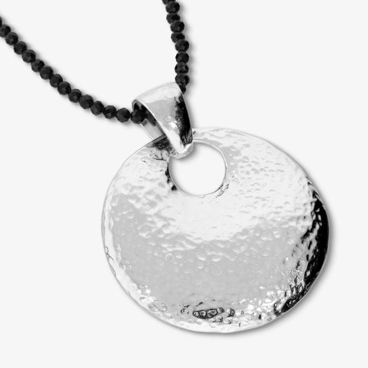 Collana Lunga in Argento 925 placcato Platino con Spinelli Neri e Pendente a Scudo Martellato Sku: M17064NAG