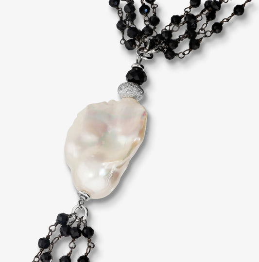 Collana Multifilo a Cravatta in Argento 925 placcato Rodio con Spinelli Neri e Perle Scaramazze Bianche d'Acqua Dolce 26x16 mm Sku: MTV592