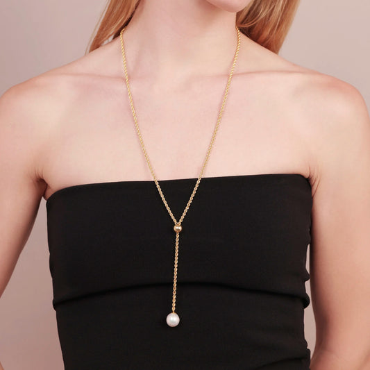 Collana Regolabile Maglia Corda in Argento 925 placcato Oro Giallo 18Kt con Bead Lucida e Perla Ming Bianca d'Acqua Dolce Ø 12/13 mm Sku: MTV593
