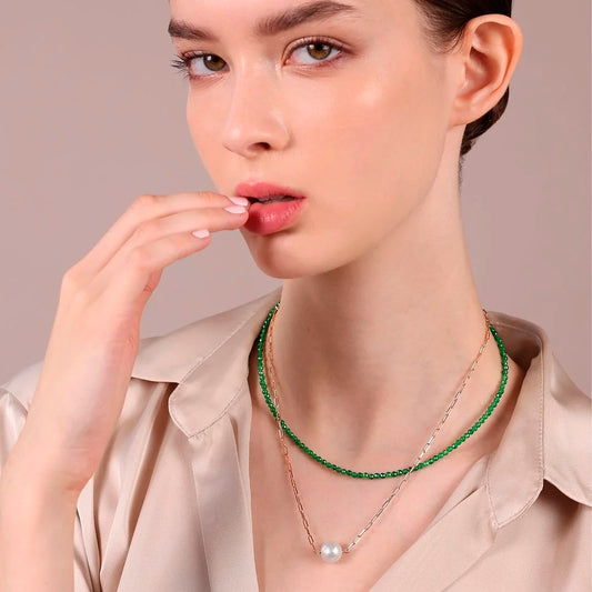 Doppia Collana Girocollo con Quarzite Verde e Maglia Forzatina con Perla Ming Bianca Ø 11 mm in Argento 925 placcato Oro rosa 18Kt Sku: MTV192