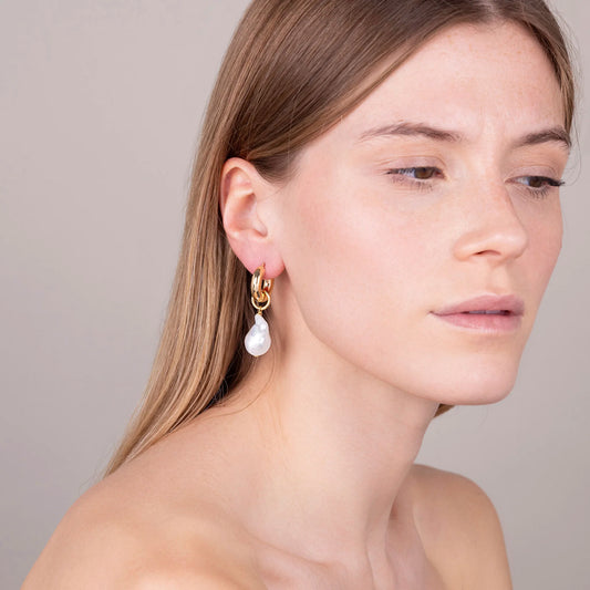 Orecchini a Cerchio in Argento 925 placcato Oro Giallo 18Kt con Perle Scaramazze Bianche d'Acqua Dolce 18x12 mm Sku: MTV583