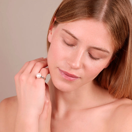 Bague Solitaire Bombée en Argent 925 Plaqué Or Blanc 18Kt avec Perle d'Eau Douce Blanche Bouton Ø 12 mm Sku: MTV123