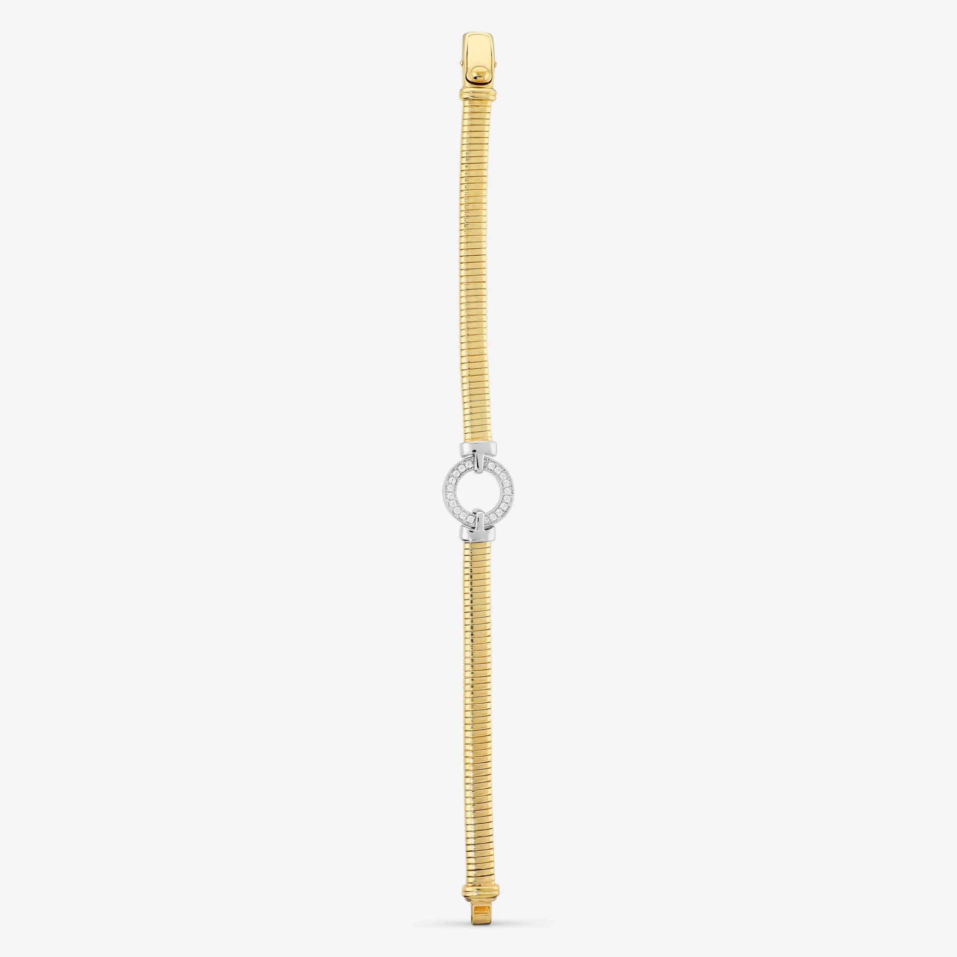 Bracciale tubogas in Argento 925, placcato Oro giallo 18kt, con maglia centrale in pavé di cubic zirconia, qualità 'Luminosa', pari a 0.35ct. Disponibile in due misure: Medium 19 cm e Large 20 cm. Chiusura a cassetto.