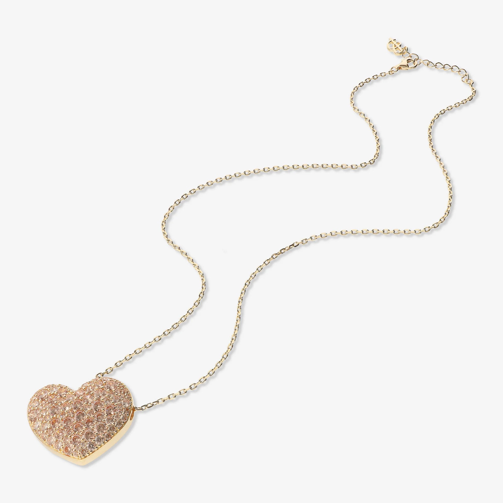 Collana maglia rolo diamantata in Argento 925 placcato Oro giallo 18kt con pendente scorrevole a forma di cuore (25x30 mm) rivestito da pavé in cubic zirconia, qualità 'Luminosa', pari a 4.8ct. Lunghezza 45+3 cm di estensione. Chiusura a moschettone.